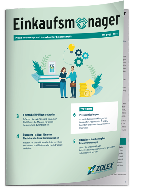 Testen Sie den Einkaufsmanager für 14 Tage völlig risikofrei ohne jegliche Verpflichtung. Falls Sie innerhalb des Testzeitraums feststellen, dass die Inhalte nicht zu Ihnen passen, können Sie jederzeit mit nur wenigen Klicks kündigen – eine kurze E-Mail genügt. Ihre Testausgabe dürfen Sie selbstverständlich behalten.